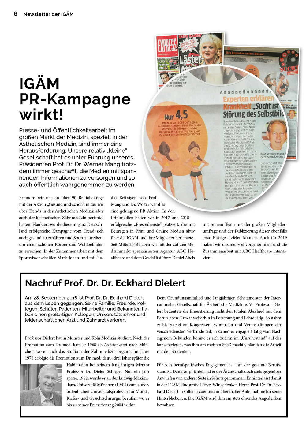 Erinnern wir uns an über 90 Radiobeiträge mit der Aktion „Gesund und schön“, in der wir über Trends in der Ästhetischen Medizin aber auch der kosmetischen Zahnmedizin berichtet hatten. Flankiert wurde diese in ganz Deutschland erfolgreiche Kampagne vom Trend sich auch gesund zu ernähren und Sport zu treiben, um einen schönen Körper und Wohlbefinden zu erreichen. In der Zusammenarbeit mit dem Sportwissenschaftler Mark Jonen und mit Radio Beiträgen von Prof. Mang und Dr. Wolter war dies eine gelungene PR Aktion. In den Printmedien hatten wir in 2017 und 2018 erfolgreiche „Pressedienste“ platziert, die mit Beiträgen in Print und Online Medien aktiv über die IGÄM und ihre Mitglieder berichtete.