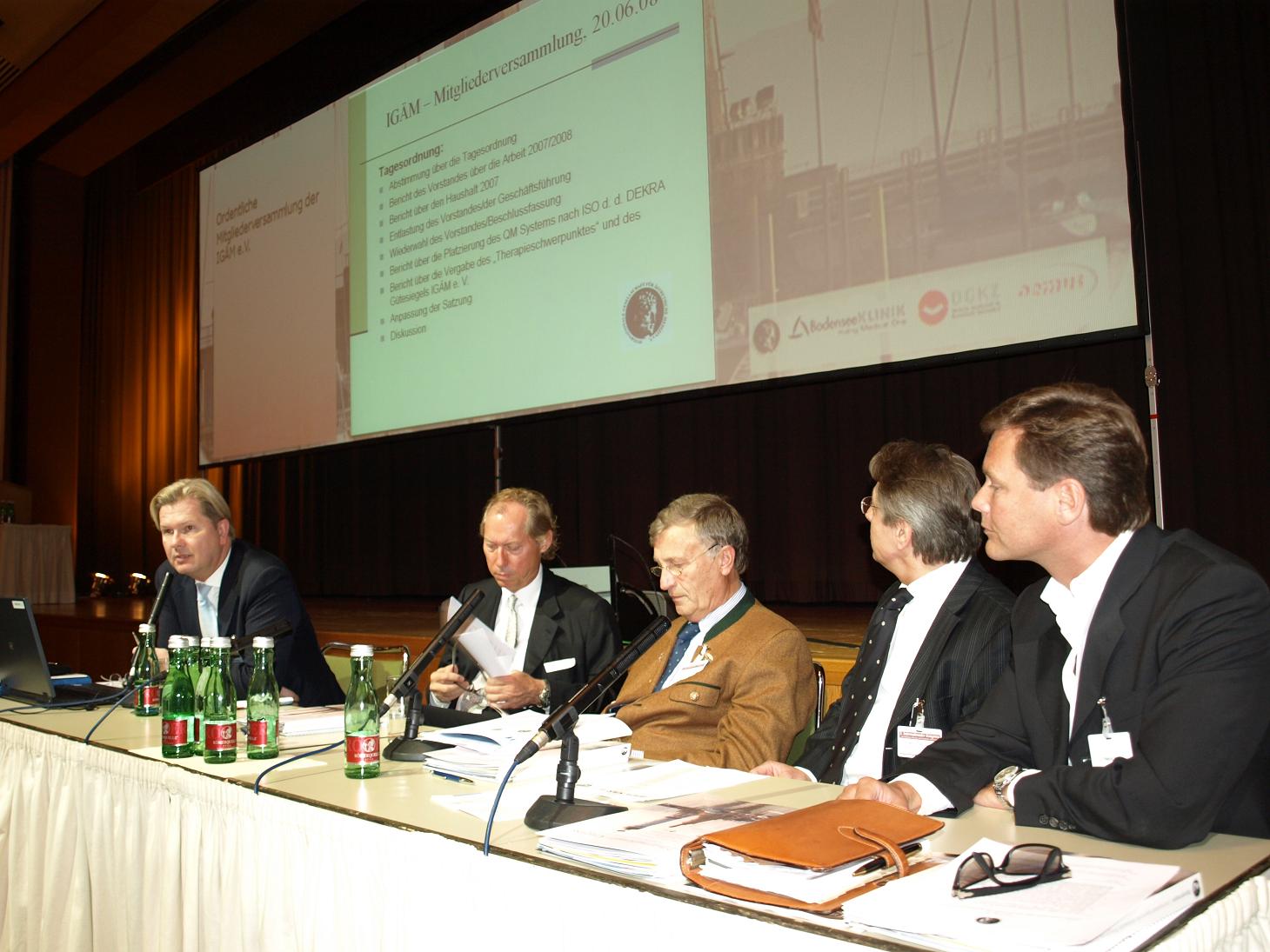 Am Freitag, den 20. Juni 2008 fand am Rande des Internationalen Kongresses für Ästhetische Medizin und kosmetische Zahnmedizin in Lindau die jährliche Mitgliederversammlung der IGÄM statt. Ohne Gegenstimmen wurde der gesamte Vorstand für die kommenden 4 Jahre im Amt bestätigt. Dieses Votum der anwesenden Mitglieder ist Ausdruck der erfolgreichen Arbeit des Verbandes in den letzten Jahren. Stetig steigende Mitgliederzahlen, eine breite öffentliche Akzeptanz und nicht zuletzt die erfolgreiche Implementierung des QM Systems nach ISO durch die DEKRA konnte der Vorstand unter Präsident Prof. Mang vermelden. Der Vorstand besteht wiederum aus dem Präsidenten Prof. Dr. Dr. Werner L. Mang (Lindau) dem Vizepräsidenten Dr. Marian Mackowski (Hamburg), dem Generalsekretär Dr. Mark Wolter, (Berlin) und dem Schatzmeister Prof. Dr. Dr. Eckart Dielert (München). Die Geschäftsführung des Verbandes wird auch weiterhin durch Dr. Torsten Hartmann (Düsseldorf) realisiert, der auch die Zentrale Geschäftsstelle in Düsseldorf leitet. Weiterhin stimmte die Mitgliederversammlung einstimmig einer notwendig gewordenen Satzungsanpassung zu.
